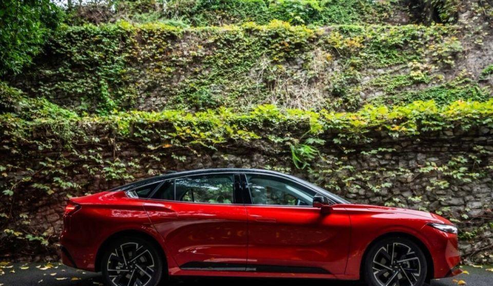 来到车身侧面,采用溜背式的车身,配备隐藏式门把手,搭配19英寸轮圈。车身尺寸方面,新车的长宽高分别为4935/1875/1500mm,轴距为2945mm。